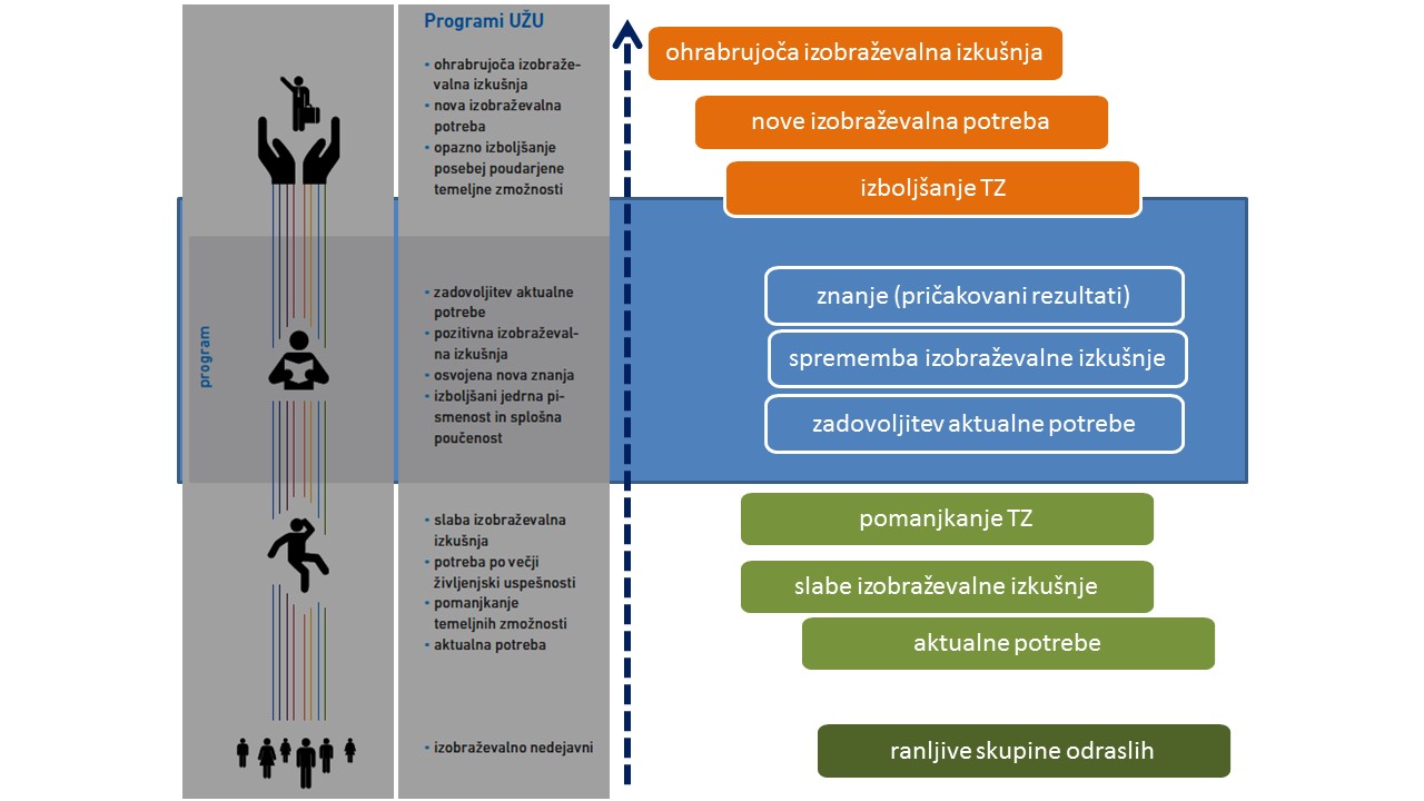 Izvirnost slovenskega modela programov za pismenost je prav v tem, da programi najprej nagovorijo skozi temeljno praktično potrebo odraslih, nato skušajo čim bolj pozitivno oblikovati novo, pozitivno izobraževalno izkušnjo in s tem povzročiti novo/nadaljnjo potrebo po učenju oziroma udeležbo v kateri od oblik izobraževanja, kakor je prikazano na spodnji shemi (Javrh, 2011).